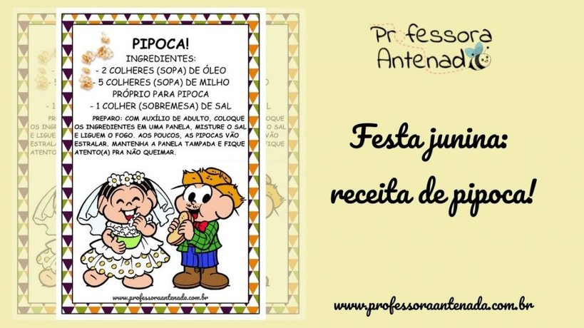 Para enriquecer seu trabalho com a temática junina preparamos essa receita colorida que pode ser entregue com milho para que os alunos realizem a atividade, com auxílio de adulto, claro. Na Educação Infantil, acompanhar e observar a preparação da pipoca é uma ótima experiência! Já para os maiores, o trabalho pode ser feito com a leitura, reescrita, interpretação da receita, ou mesmo com relato da experiência de preparar pipoca.