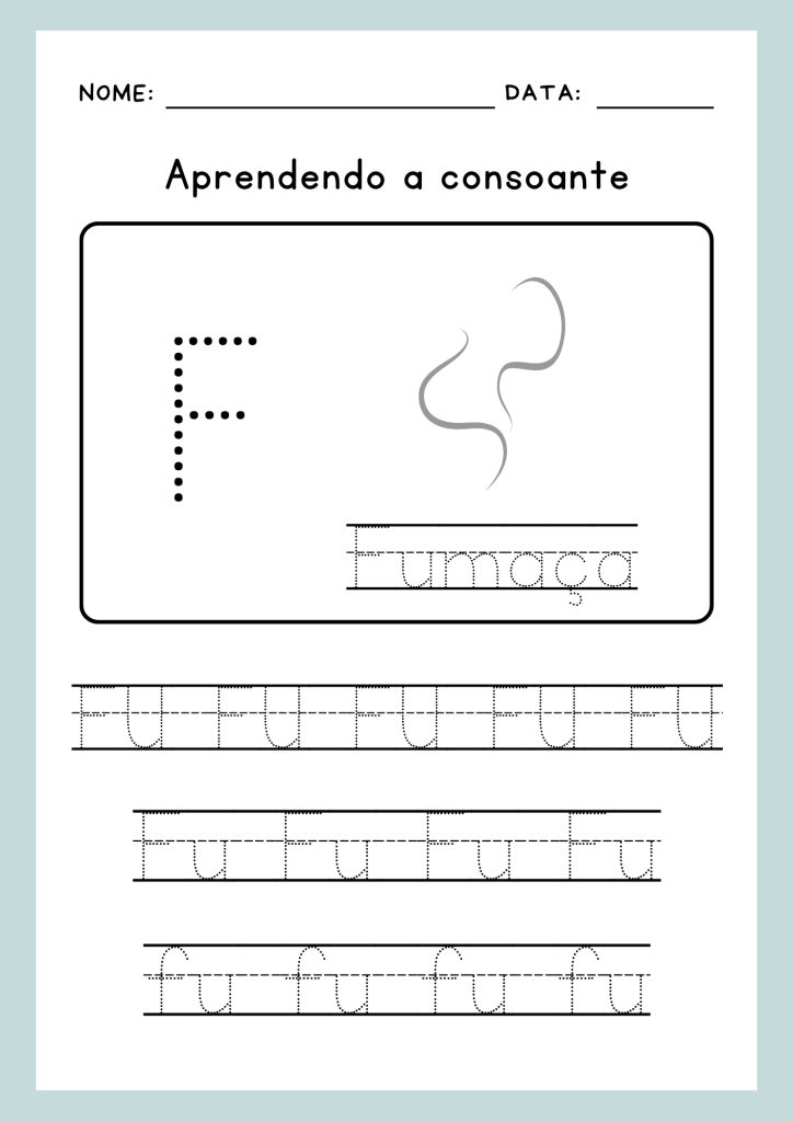 Atividade de consoantes com a letra f Alfabetização, Consoantes Vamos aprender com a letra F! Nesta atividade, as crianças vão praticar a letra F e as sílabas fa, fe, fi, fo, fu. Vamos explorar palavras que começam com essas sílabas e brincar com sons e combinações. Preparados para mergulhar no mundo da letra F? Download Download Download Download Download Tags:aprendendo letra fatividades para criançasensinar fonéticaletra fpalavras com fasílaba fasílaba fesílaba fisílaba fosílaba fu
