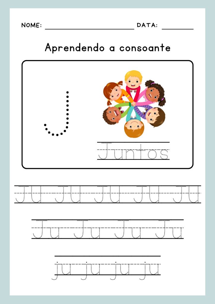 Atividade de consoantes com a letra j Alfabetização, Consoantes Vamos aprender com a letra J! Nesta atividade, as crianças vão praticar a letra J e as sílabas ja, je, ji, jo, ju. Vamos explorar palavras que começam com essas sílabas e brincar com sons e combinações. Preparados para mergulhar no mundo da letra J? Download Download Download Download Download Tags:aprendizado infantilatividades educativasfonética infantilletra jpalavras com jsílabas jasílabas jesílabas jisílabas josílabas ju