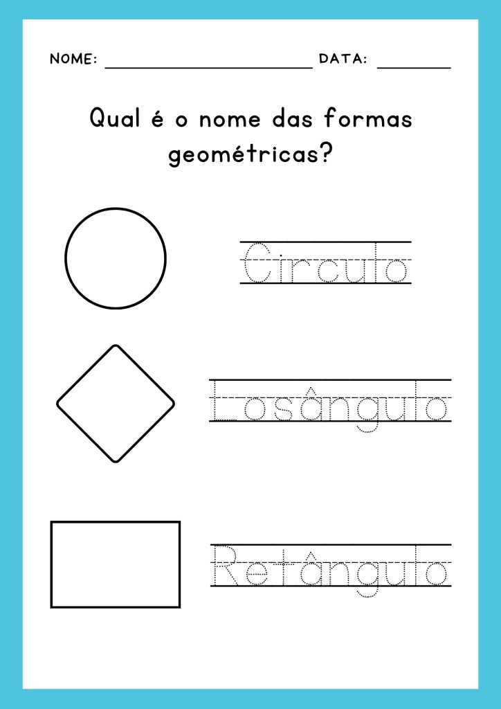 Nesta atividade, as crianças vão observar as figuras geométricas e escrever o nome de cada uma delas. Um ótimo jeito de praticar a leitura e o reconhecimento dessas formas tão importantes no nosso dia a dia. Prontos para começar?