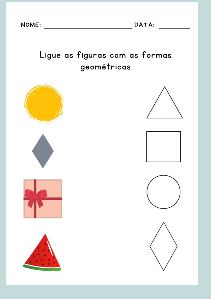 Atividade Ligue a imagem a figura geométrica Alfabetização, Formas Geométricas Vamos ligar as imagens às figuras geométricas! Nesta atividade, vamos observar as figuras geométricas e ligá-las às imagens correspondentes. Essa é uma ótima forma de exercitar o raciocínio e aprender mais sobre as formas. Vamos começar? Download Download Download Download Download Tags:aprender formasatividades educativasatividades lúdicaseducação infantilexercício de raciocíniofiguras geométricasgeometriajogo de ligar