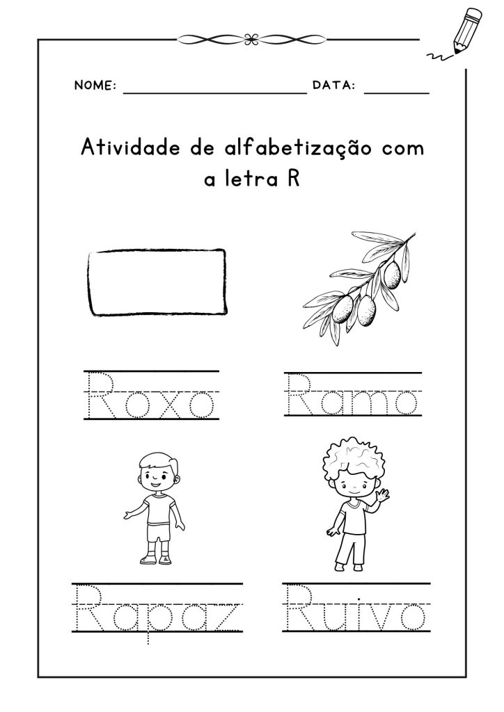 ✍️ Atividade de alfabetização com a letra R 📖 Alfabetização, Alfabeto Vamos explorar a letra R! Esta atividade ajuda as crianças a reconhecer, escrever e identificar palavras que começam com a letra R, ampliando seu vocabulário e desenvolvendo a habilidade de alfabetização. Download Download Download Tags:conteúdos