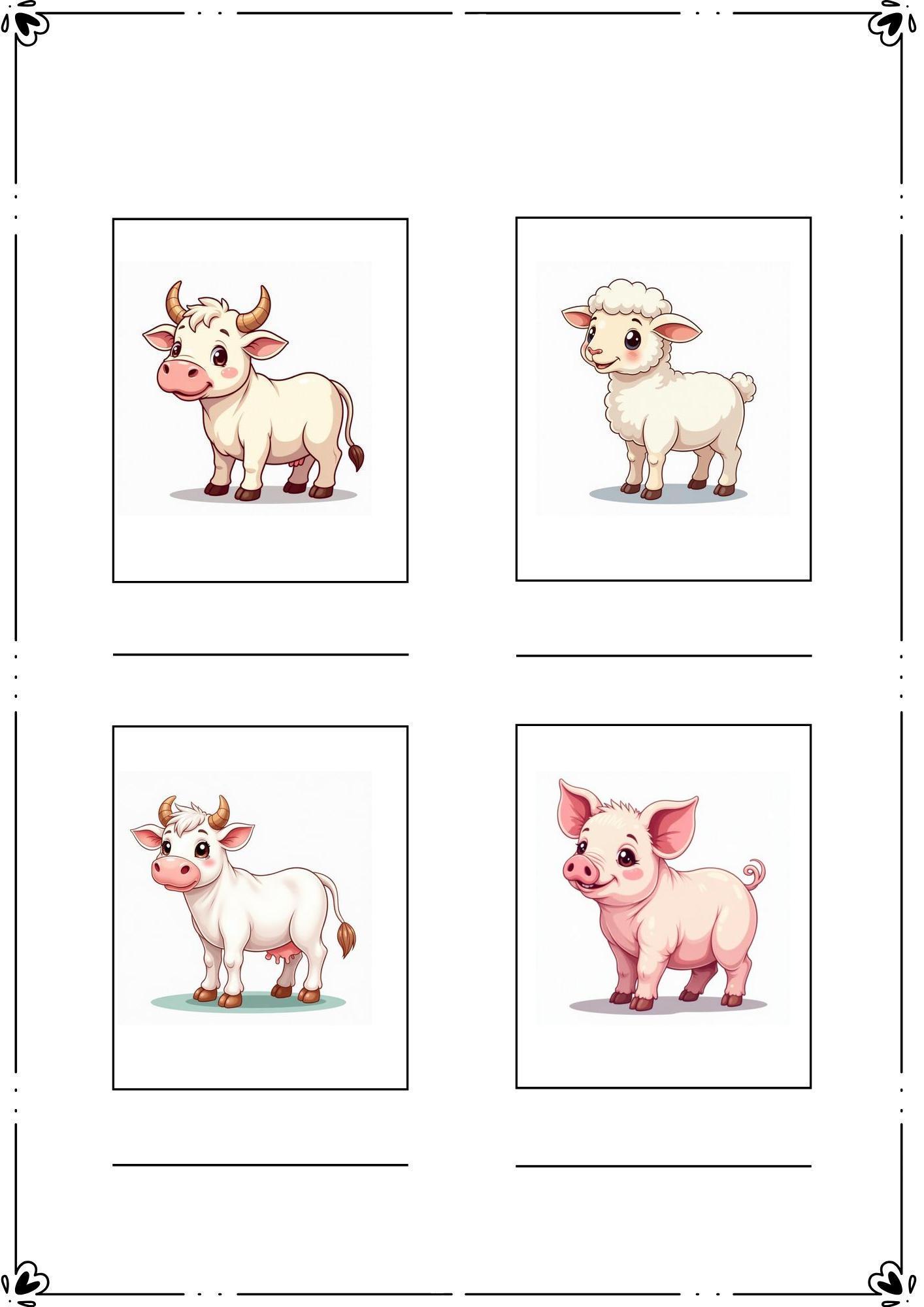 Na primeira imagem, vemos um boi robusto, uma ovelha fofinha, uma vaca elegante e um porco com a barriga sorridente. Todos eles se juntam num cenário alegre e convidativo. Agora é a sua vez de escrever os nomes que aparecem!