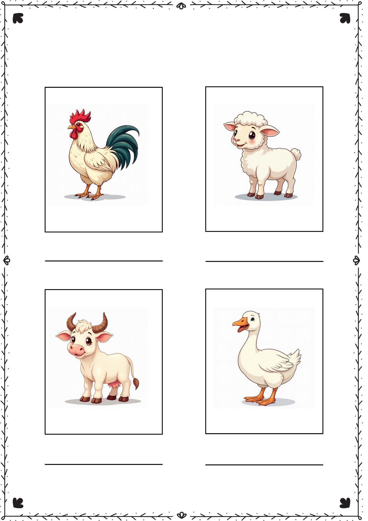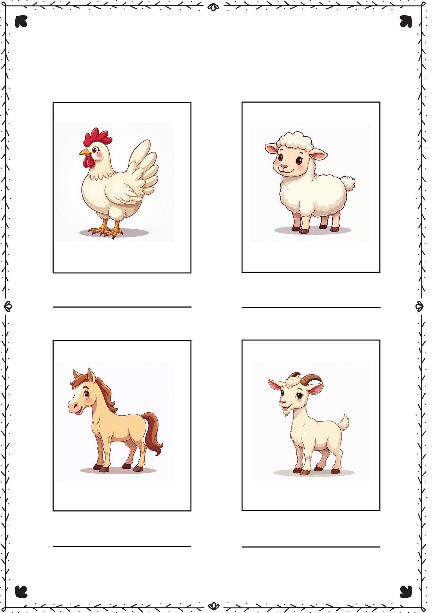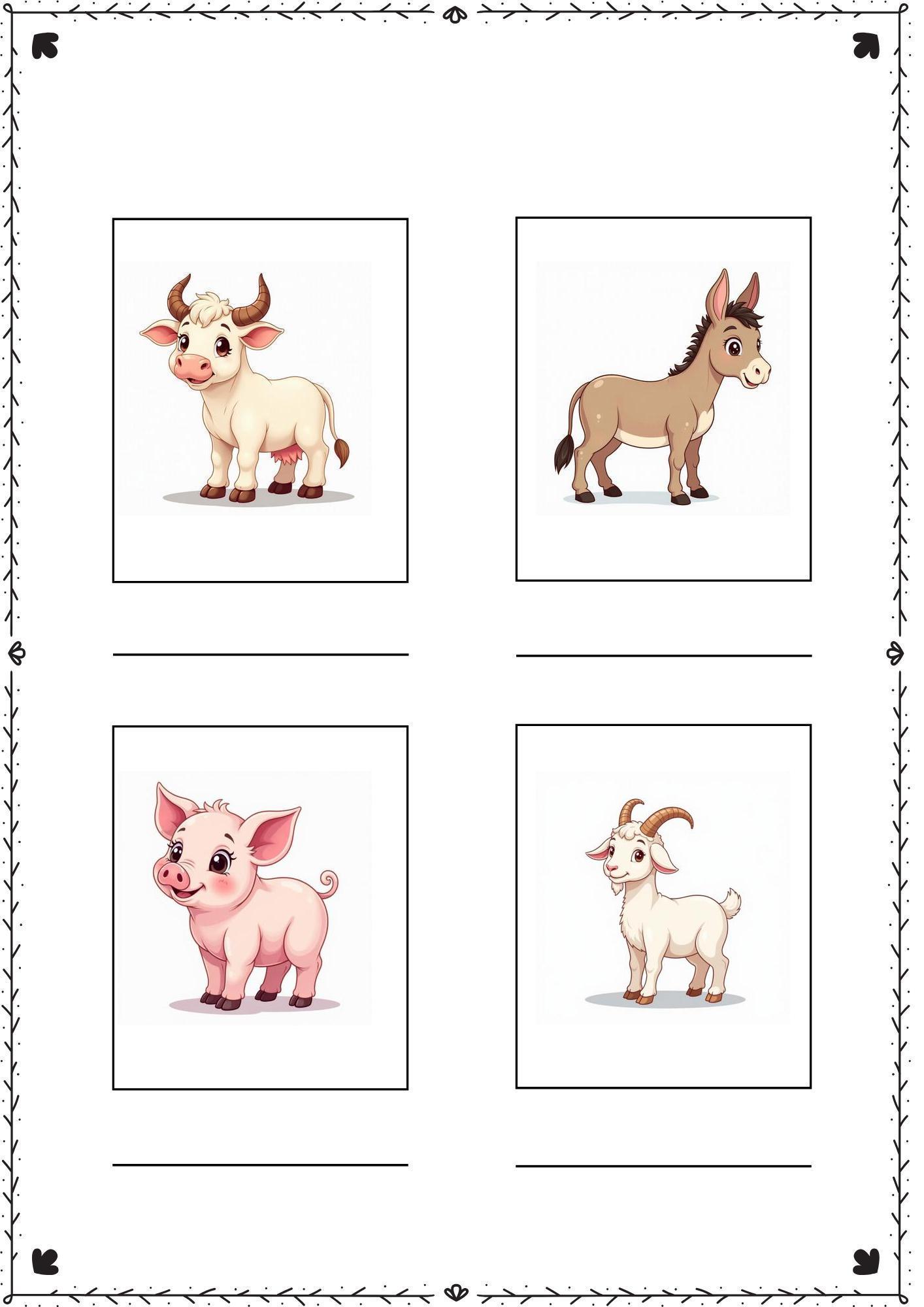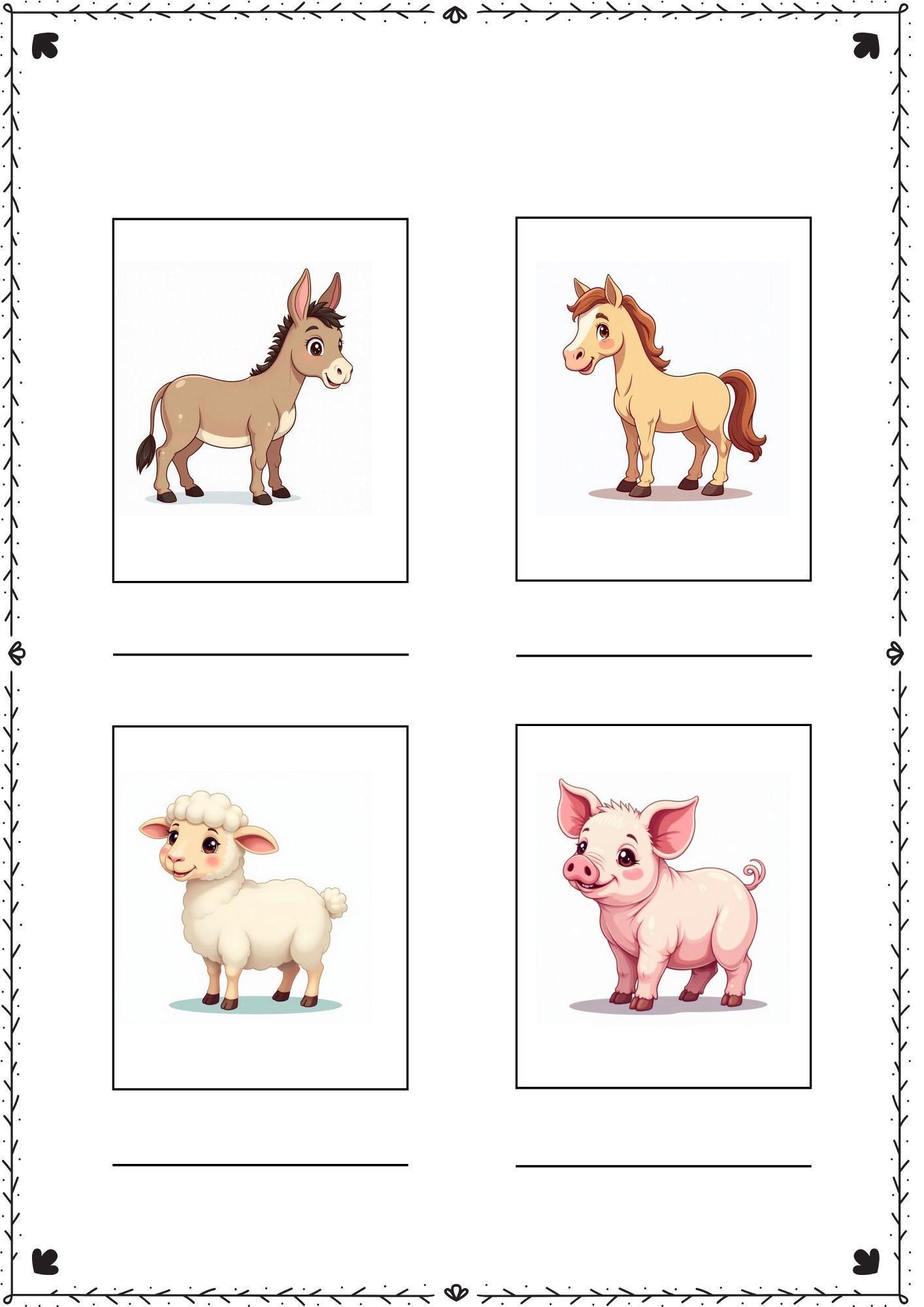 Na primeira imagem, vemos um burro caminhando com passos firmes, ao lado um cavalo elegante que parece pronto para saltar. Uma ovelha macia pasta tranquilamente, enquanto um porco suquinho se diverte batendo as orelhas no chão. Todos esses amigos estão prontos para ser identificados.