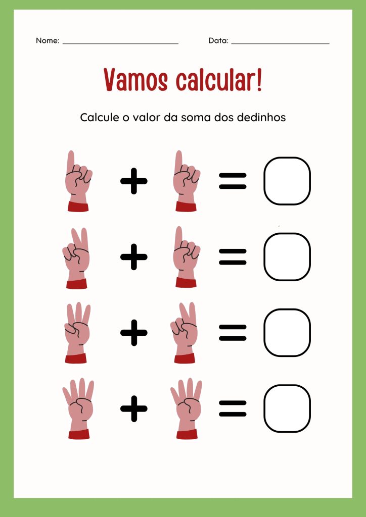 Nesta atividade divertida e interativa, as crianças vão praticar a soma de maneira lúdica, usando os próprios dedinhos como ferramentas de contagem. ️️ Ideal para os primeiros anos do ensino fundamental, essa dinâmica ajuda a desenvolver o raciocínio lógico e a compreensão dos conceitos básicos de matemática de forma visual e tátil. É uma forma eficaz de tornar o aprendizado dos números simples e envolvente!