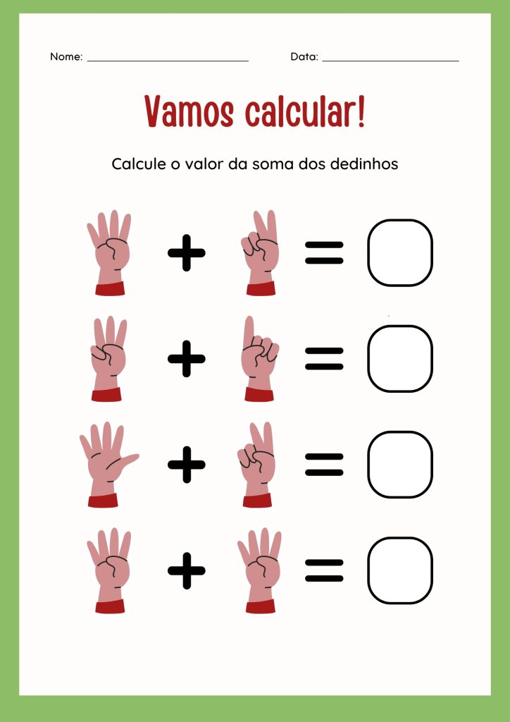Vamos transformar a matemática em uma brincadeira! Nesta atividade, os pequenos vão aprender a somar utilizando os próprios dedos para representar números. 爐 Além de fortalecer o conceito de adição, essa prática estimula o desenvolvimento da coordenação motora e do pensamento lógico. Perfeita para ensinar matemática de maneira divertida e acessível para crianças em fase de alfabetização.