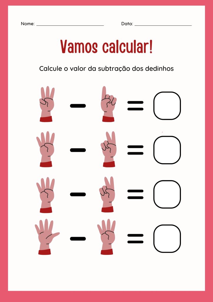 Nesta atividade, vamos aprender a subtrair de forma divertida usando os dedinhos. A cada número que retiramos, o resultado fica claro e fácil de entender. Essa abordagem lúdica ajuda as crianças a desenvolverem o pensamento lógico enquanto se divertem com a matemática. Preparados para começar?