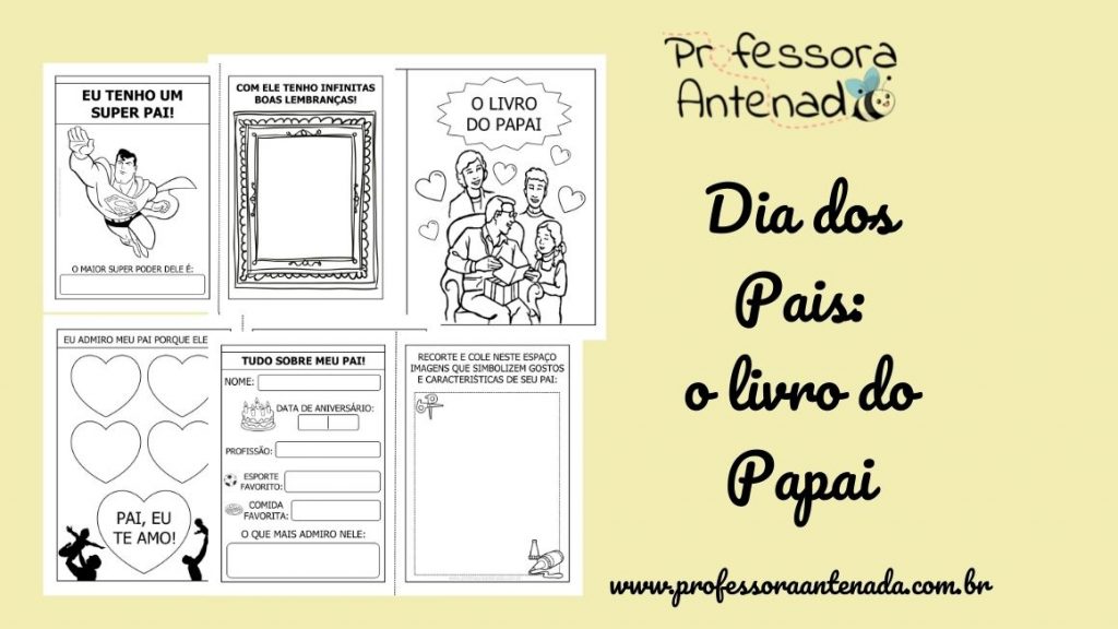 O dia dos Pais está chegando! No livro do Papai terão várias atividades para trabalhar com os alunos. Para ficar em formato livreto imprimir frente e verso (assim também economizará papel!). O livro é uma proposta para conhecer mais a figura paterna e também homenageá-la, sendo assim, um presente para o pai. Separamos também algumas sugestões de mensagens e vídeos para essa data tão especial.